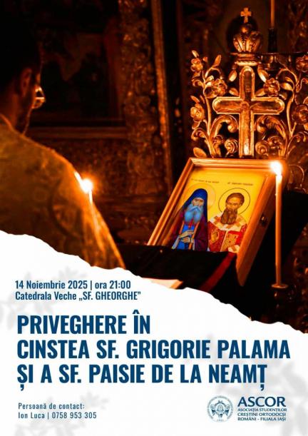 Asociația Studenților Creștini Ortodocși Români – Filiala Iași organizează privegherea în cinstea Sfântului Grigorie Palama și a Sfântului Paisie de la Neamț, care va avea loc la Catedrala Veche „Sfântul Gheorghe”, începând cu ora 21.00. Evenimentul se adresează, în mod deosebit, voluntarilor ASCOR Iași și studenților.